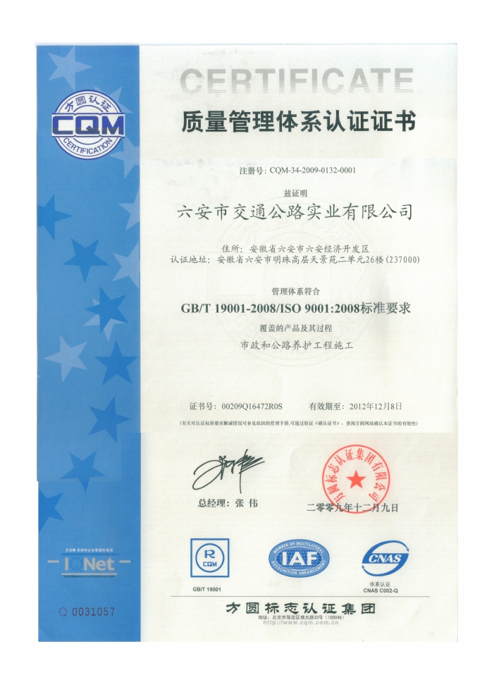 公司取得ISO9001認證及市政總承包三級資質(zhì)